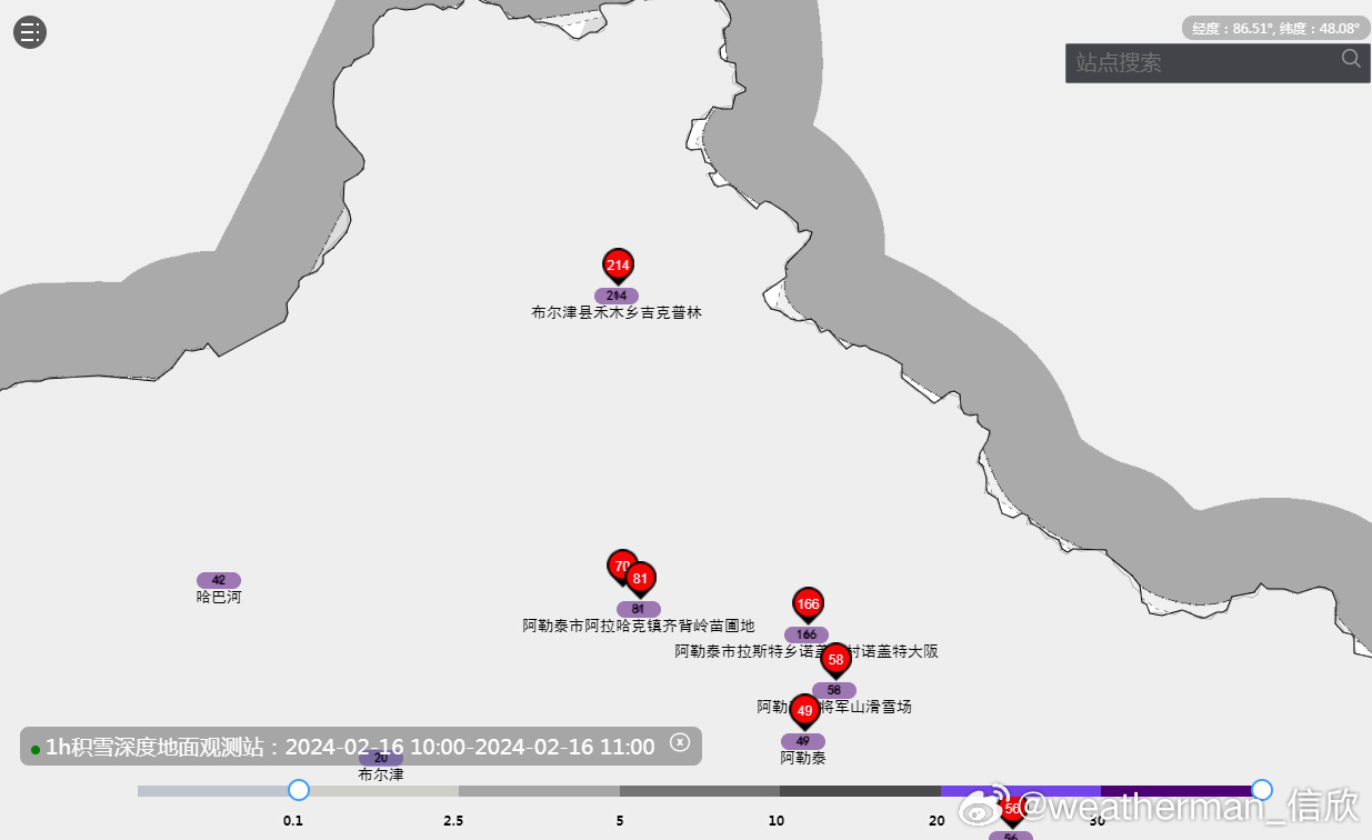 來自新疆氣象臺的實況數據顯示,2月15日8時至16日8時,塔城地區塔城市,阿勒泰地區阿勒泰市、哈巴河縣、布爾津縣、青河縣、富蘊縣等21站暴雪,阿勒泰地區阿勒泰市、哈巴河縣、吉木乃縣、布爾津縣、富蘊縣共12站大暴雪,阿勒泰地區布爾津縣禾木鄉站特大暴雪。阿勒泰地區北部東部山區新增積雪17—68厘米。