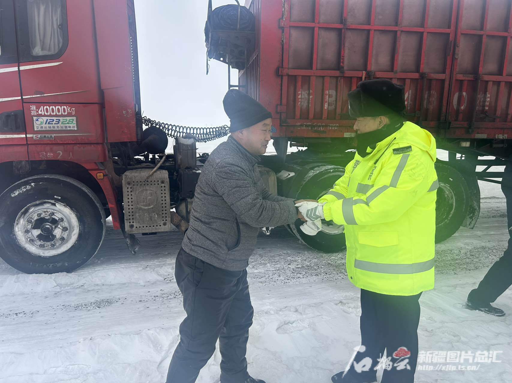 2月16日,駕駛?cè)藢?duì)前來救援的和布克賽爾蒙古自治縣公安局民警表示感謝。和布克賽爾蒙古自治縣公安局供圖
