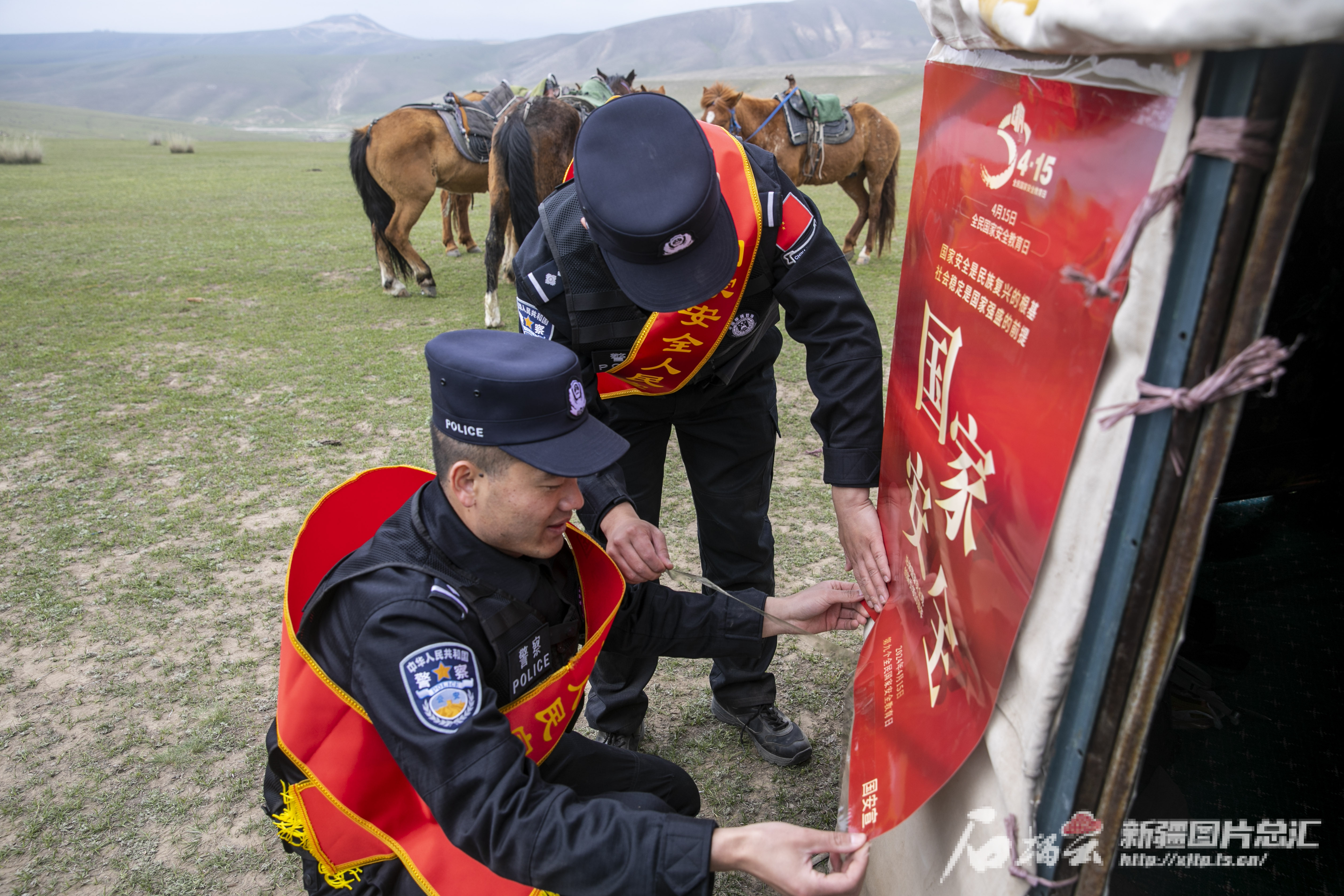 紅卡子邊境派出所民警在牧區張貼全民國家安全教育海報。周航生 攝