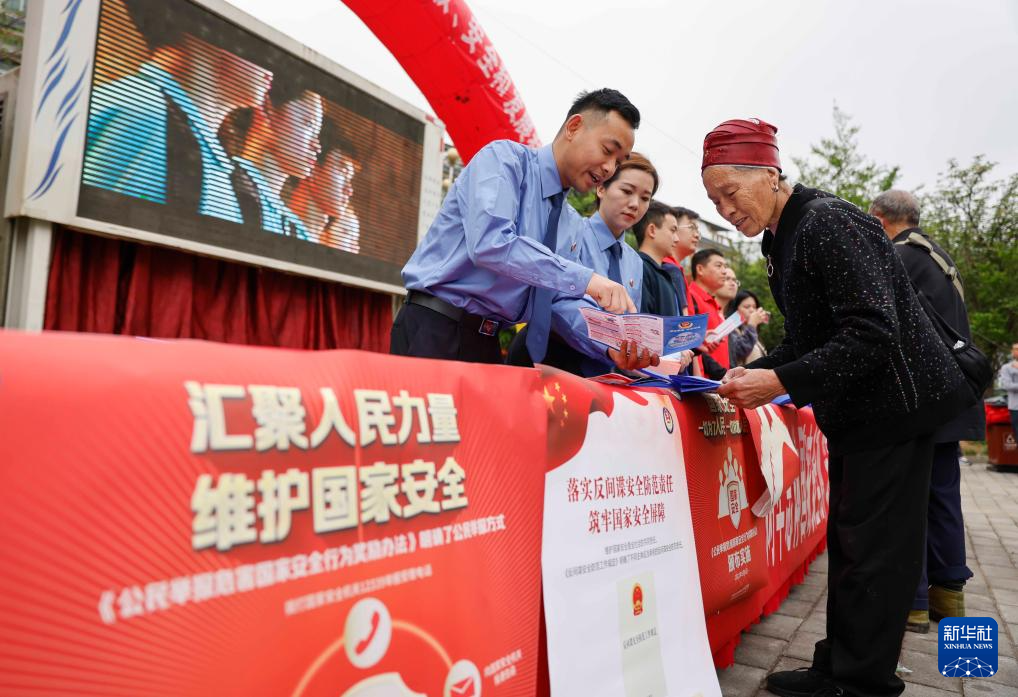 4月14日,檢察干警在貴州省黔東南苗族侗族自治州施秉縣向群眾宣傳國家安全知識。新華社發(磨桂賓攝)
