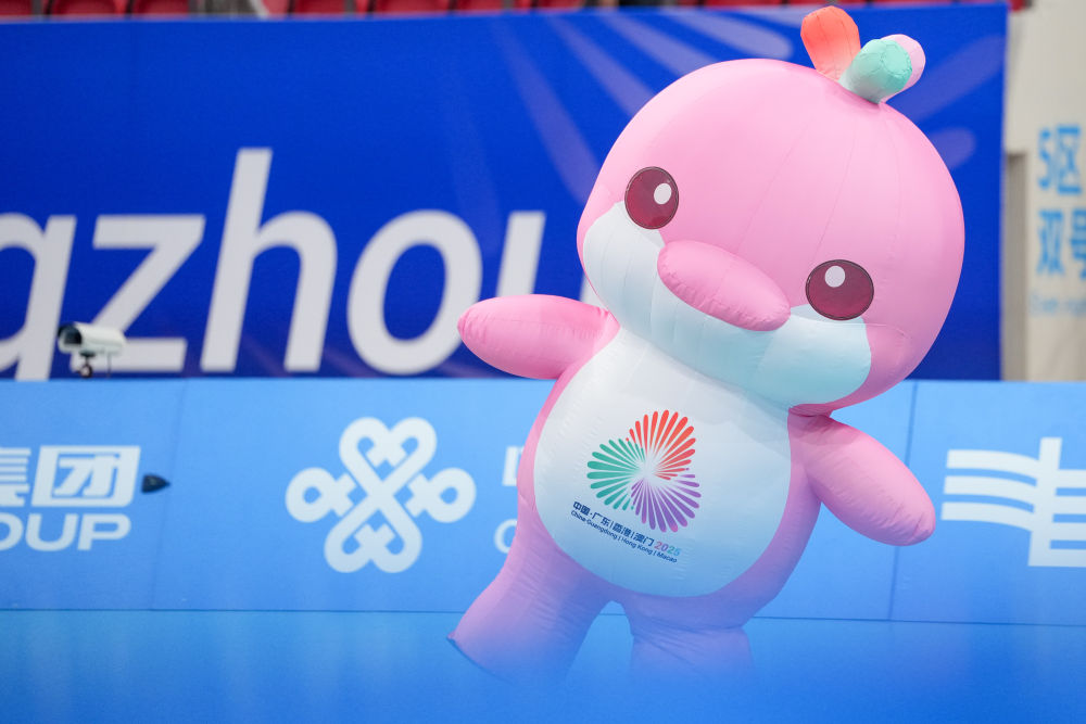 11月11日,吉祥物“喜洋洋”“樂融融”在惠州舉行第十五屆全國運動會滑板項目頒獎儀式前。新華社記者 劉坤 攝
