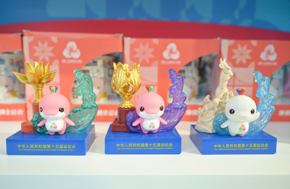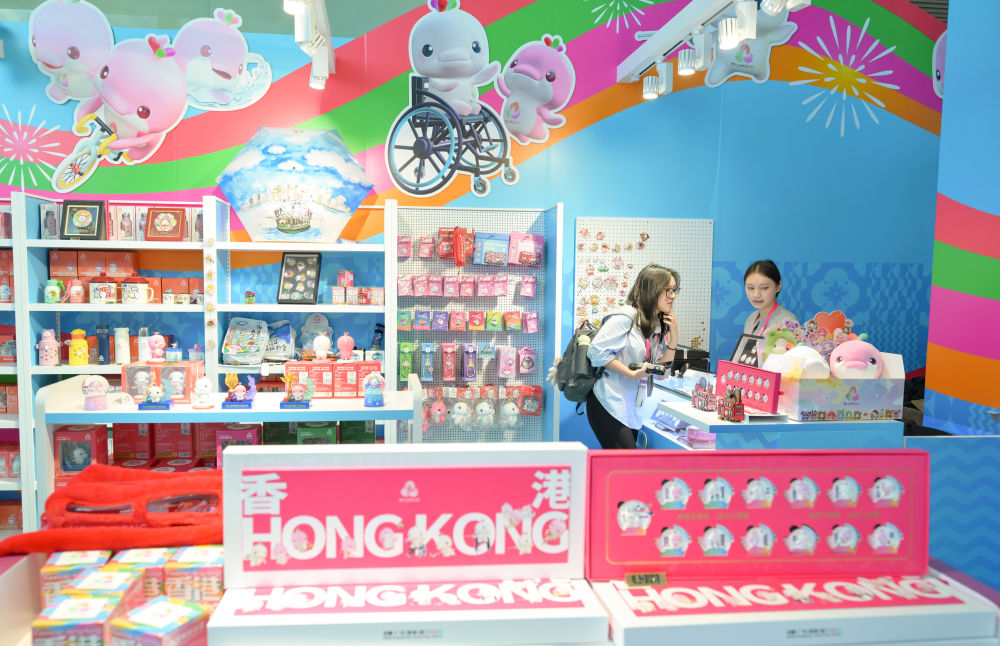 11月12日,在第十五屆全國運動會香港賽區主新聞中心特許商品零售店拍攝的一組吉祥物形象文創產品。新華社記者 胡虎虎 攝