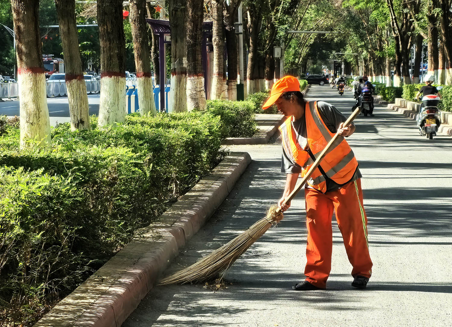 圖為6月17日,在高昌區(qū)街頭,環(huán)衛(wèi)工人清掃垃圾,為廣大群眾和游客創(chuàng)造一個更加干凈整潔的生活環(huán)境和出行環(huán)境。 葡萄熟了/吐魯番市融媒體中心記者 劉健 攝