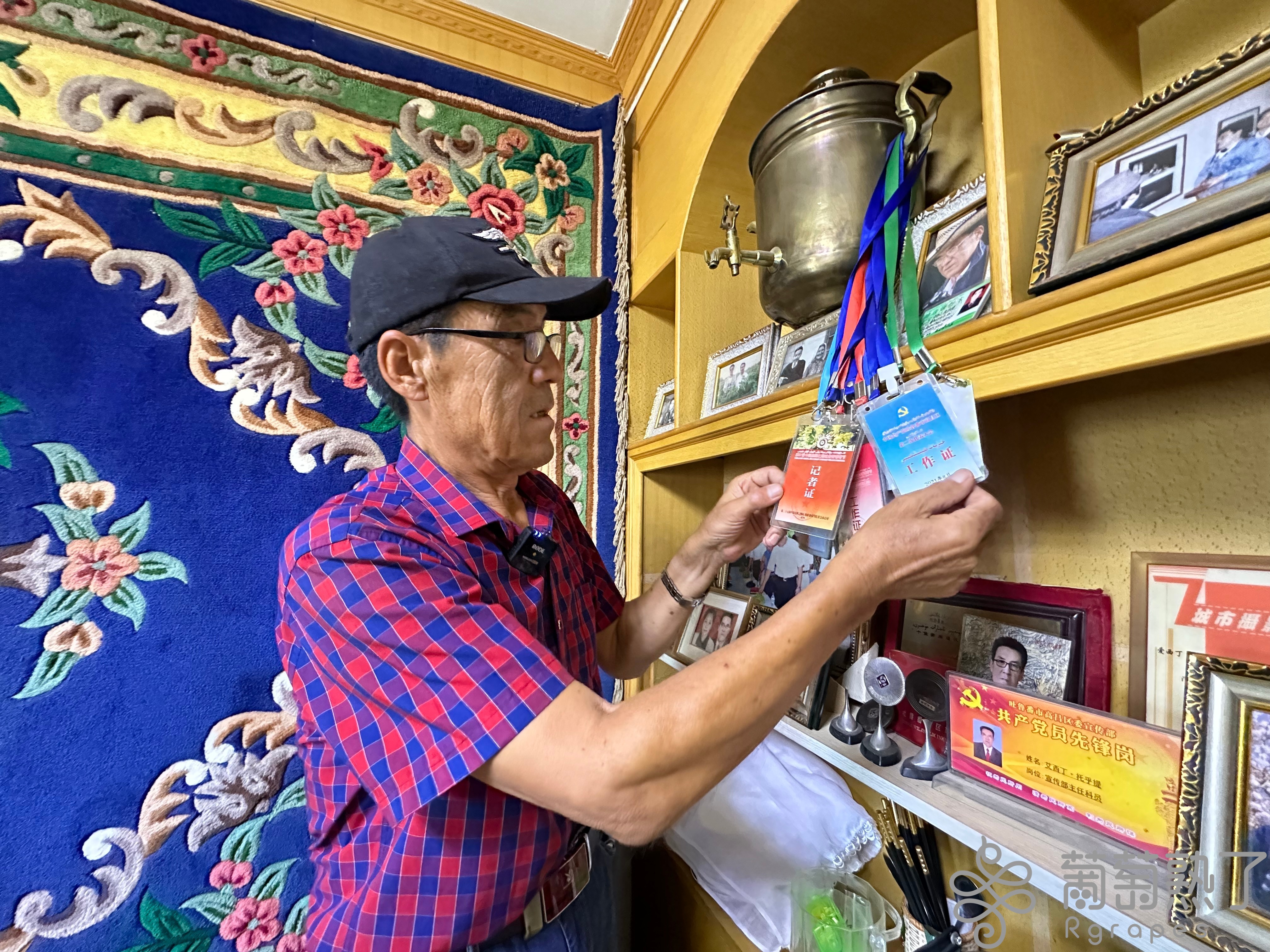 8月1日,艾西丁展示參加歷屆葡萄節的工作證。葡萄熟了/吐魯番市融媒體中心記者 阿地蘭 攝