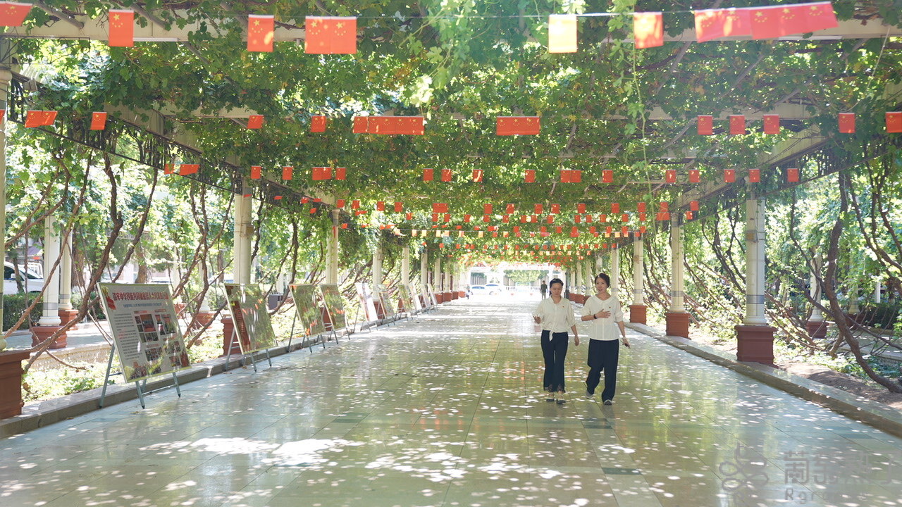 高昌區青年路葡萄長廊掛滿了一面面小型的國旗,在葡萄藤的襯托下,顯得格外醒目。市民王存芳說:“看著這些五星紅旗,我心中的愛國之情油然而生。新中國即將迎來75周年華誕,衷心祝愿我們偉大的祖國越來越繁榮富強。”
