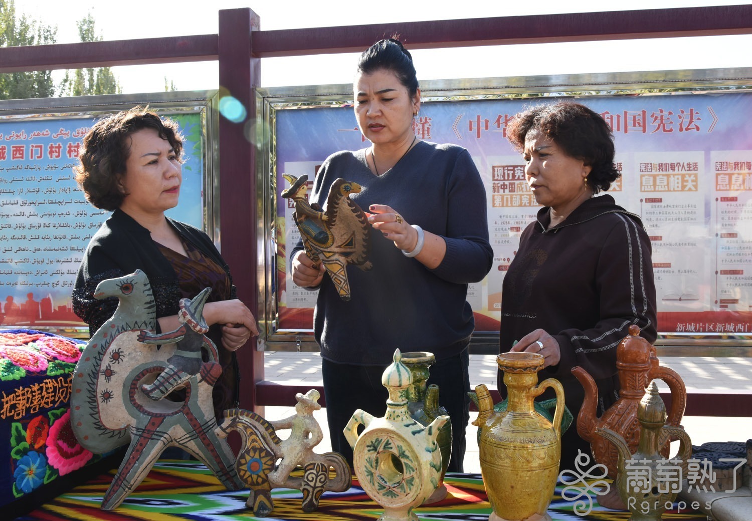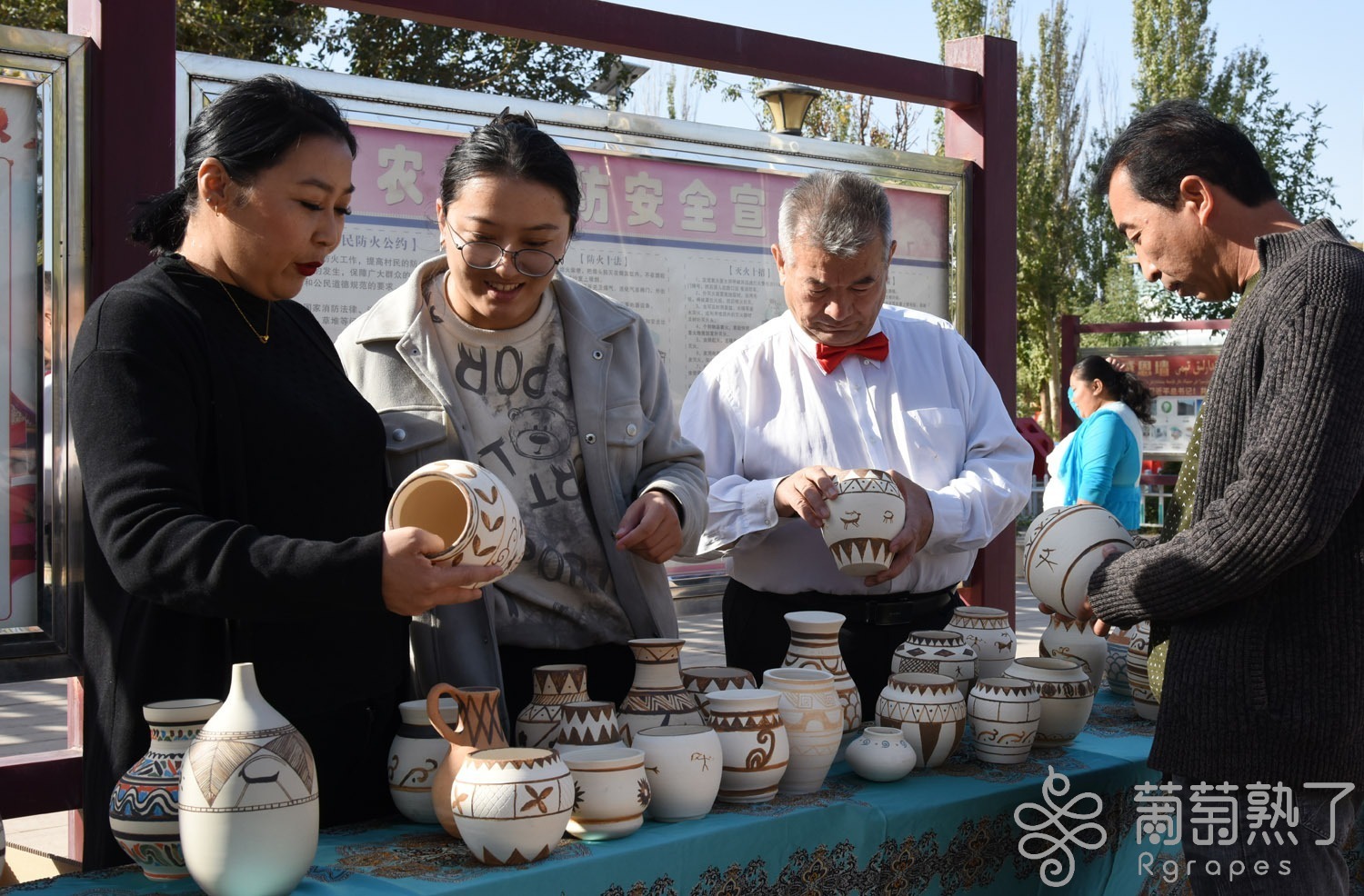 群眾在非遺產品展臺欣賞土陶制品。葡萄熟了/吐魯番市融媒體中心記者 劉健 攝