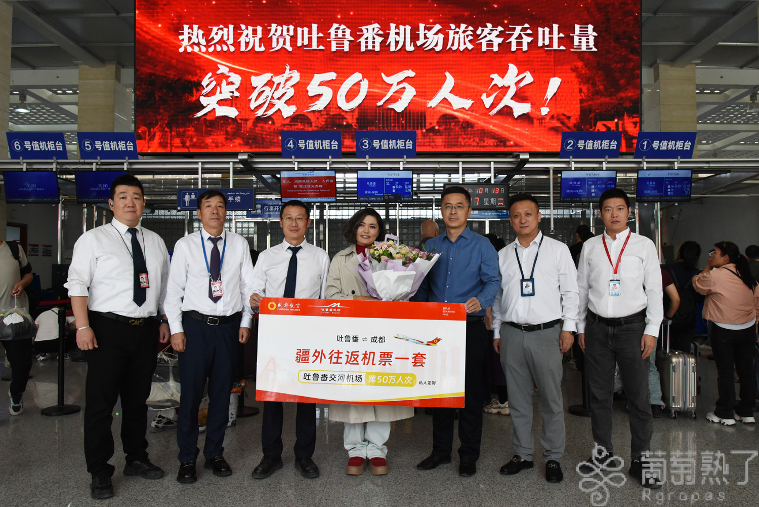 吐魯番機場為第50萬名旅客送上鮮花和機票等獎品。葡萄熟了/吐魯番市融媒體中心記者 劉健 攝
