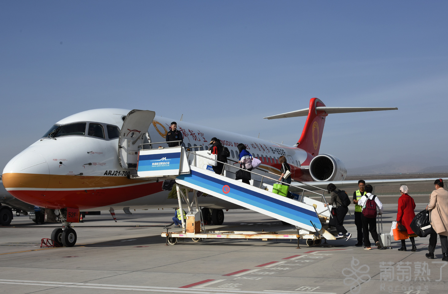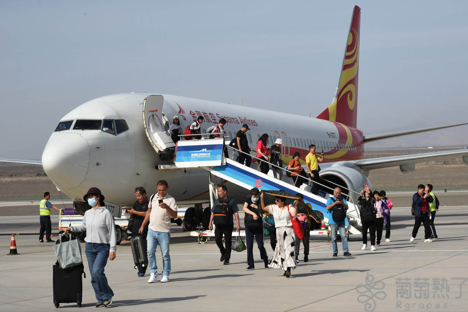 在吐魯番機場停機坪,旅客平安抵達、走下飛機。葡萄熟了/吐魯番市融媒體中心記者 劉健 攝