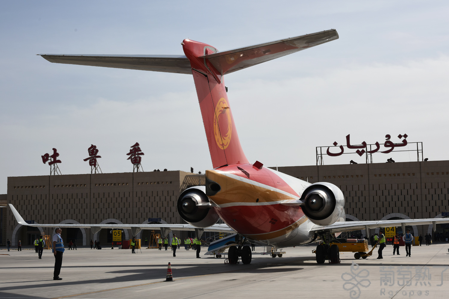 “吐魯番號”主題飛機降落在吐魯番機場。葡萄熟了/吐魯番市融媒體中心記者 劉健 攝