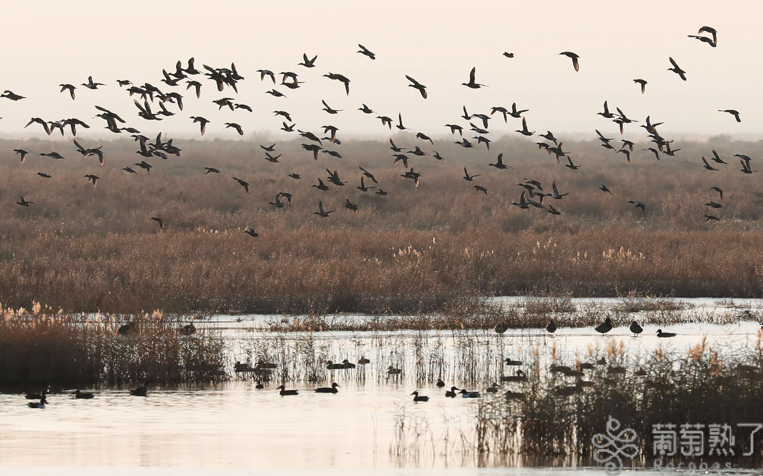 11月26日,成群的候鳥在艾丁湖濕地上空飛翔。葡萄熟了/吐魯番市融媒體中心記者 劉健 攝