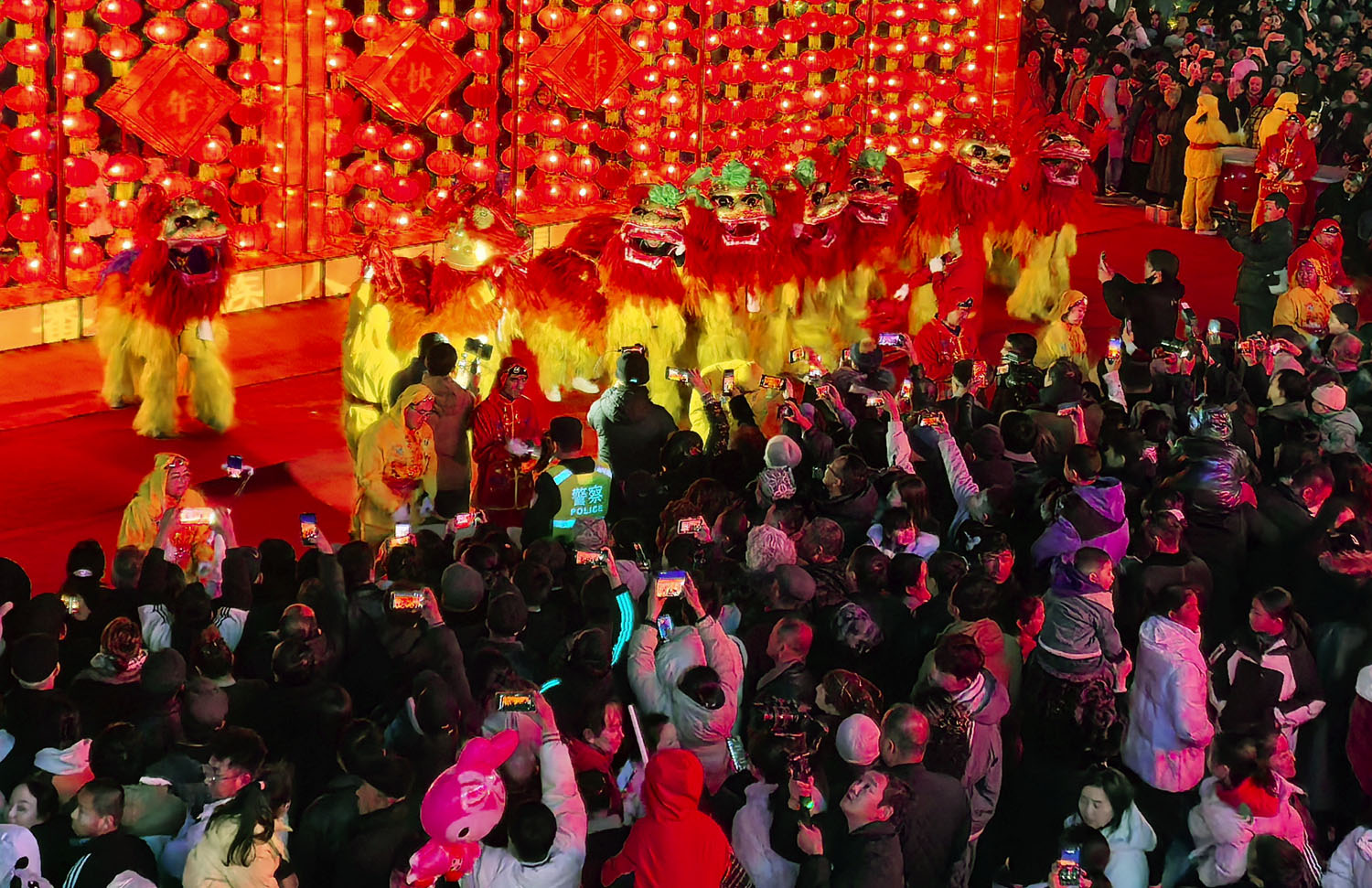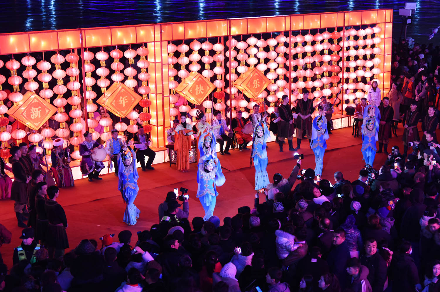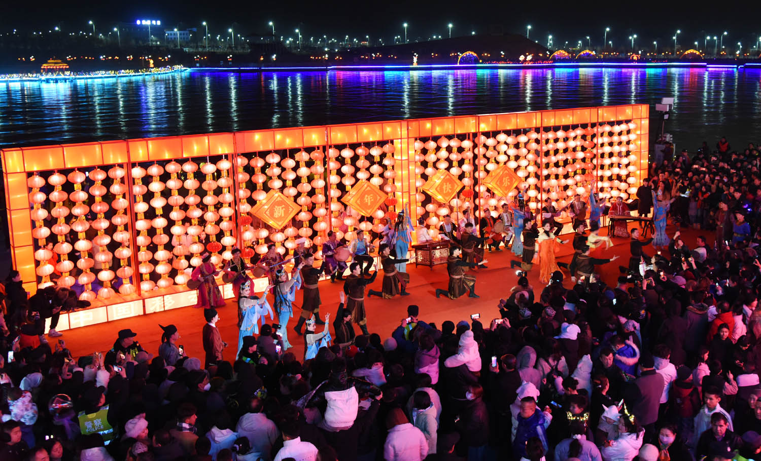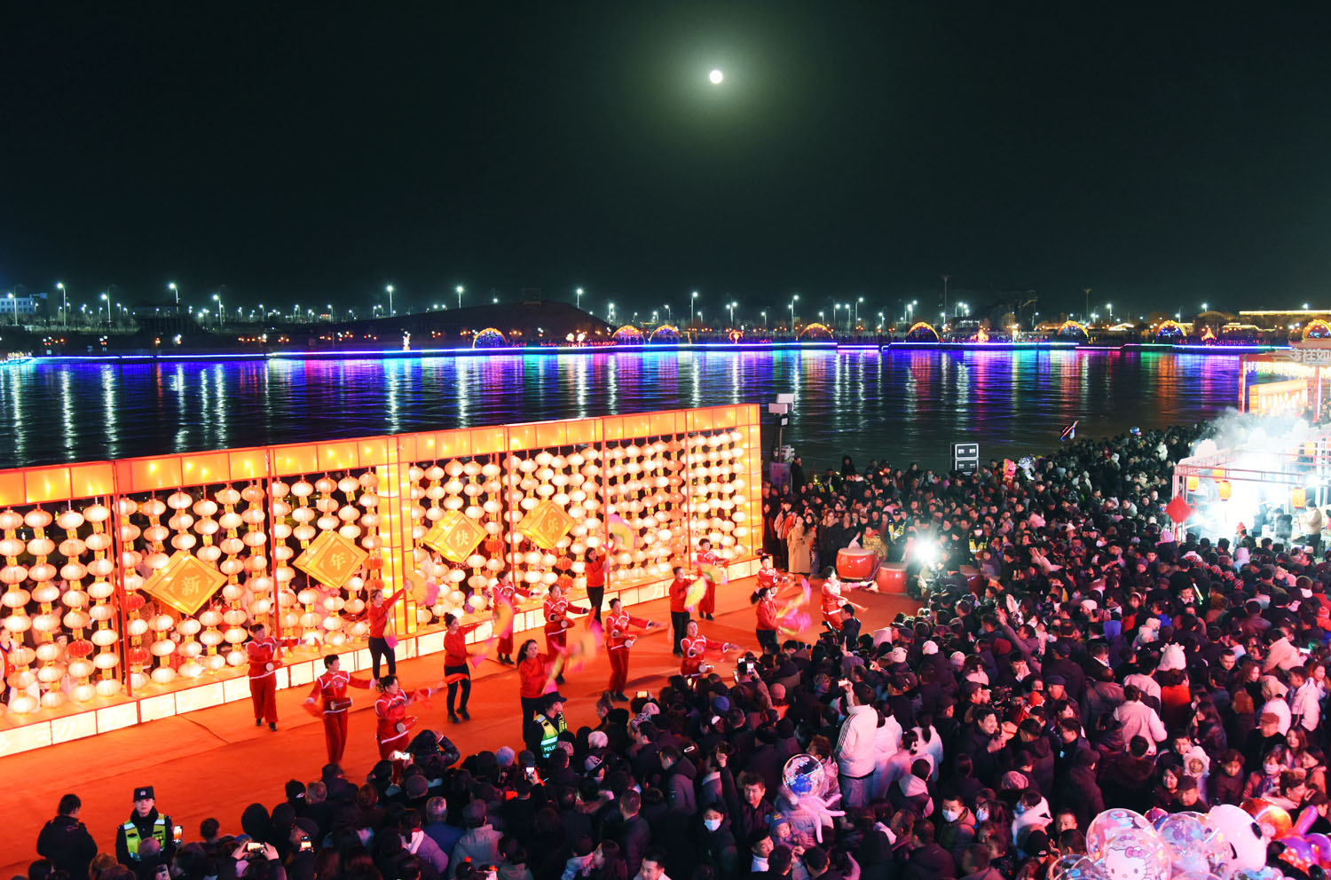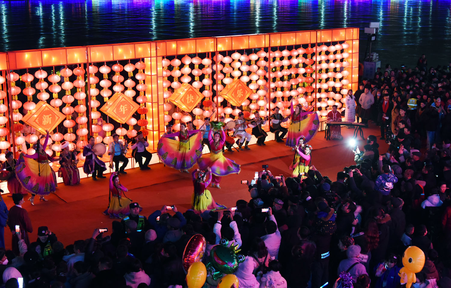 2月12日(正月十五)晚,高昌區(qū)月光湖畔一場(chǎng)以“金蛇獻(xiàn)瑞 福耀火洲”為主題的元宵焰火晚會(huì)(無(wú)人機(jī)秀)精彩上演,千架無(wú)人機(jī)編隊(duì)與璀璨焰火交相輝映,為市民和游客呈現(xiàn)傳統(tǒng)民俗與現(xiàn)代科技交融的文化盛宴。圖為市民和游客在高昌區(qū)月光湖觀看燈展和文藝表演。吐魯番市融媒體中心記者 劉健 攝