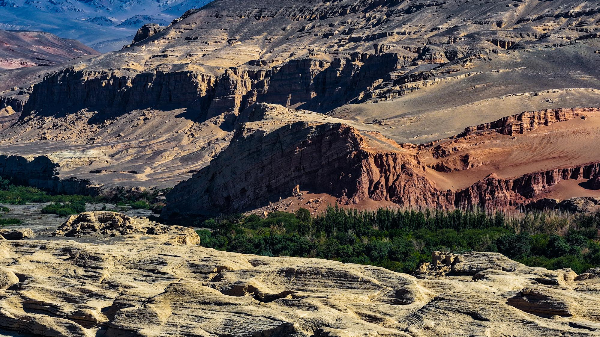 托克遜雅丹地貌與白楊河、天山紅河谷毗鄰共生。盛夏時節,赭黃的雅丹群、赤焰般的紅河谷、翡翠般的白楊河交相輝映,構成一幅瑰麗的地質奇觀。