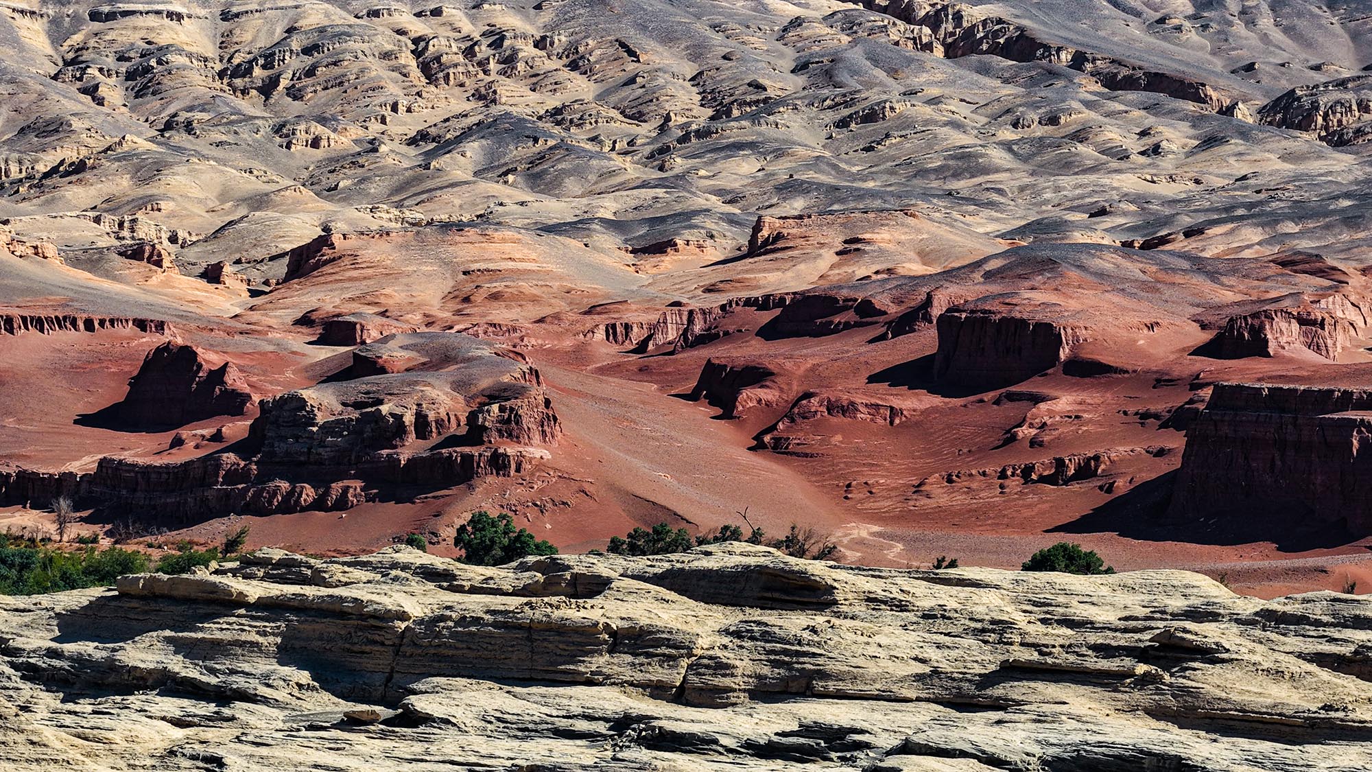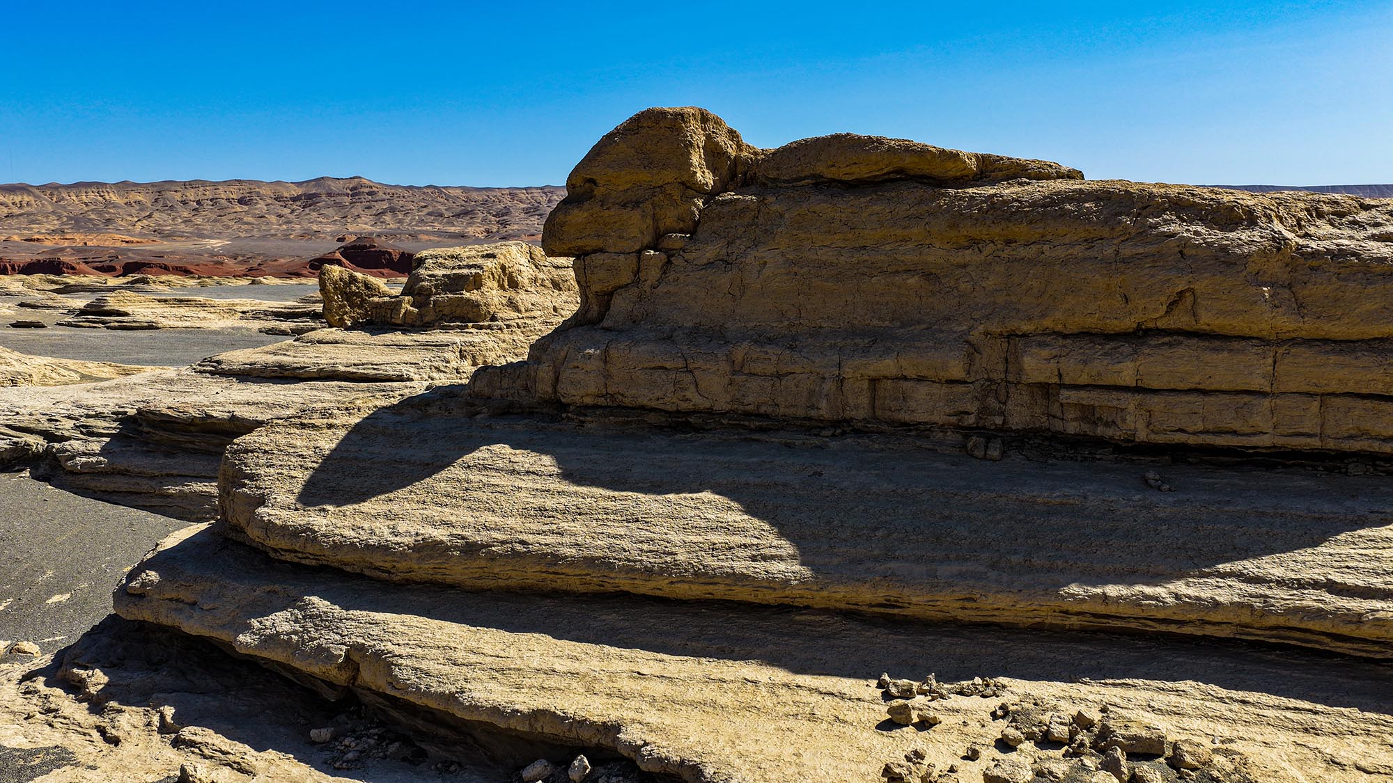 該雅丹帶呈南北縱向延展,主體區域綿延3.5公里,最寬處達600米。地質考證顯示,一億年前此處曾是浩渺淡水湖,歷經兩次劇烈構造抬升與擠壓褶皺,湖相沉積層逐漸演化為砂泥巖互層的干旱臺地。在季節性洪流切割與風沙雕琢的共同作用下,巖層被解構成如今鱗次櫛比的魔幻方陣。