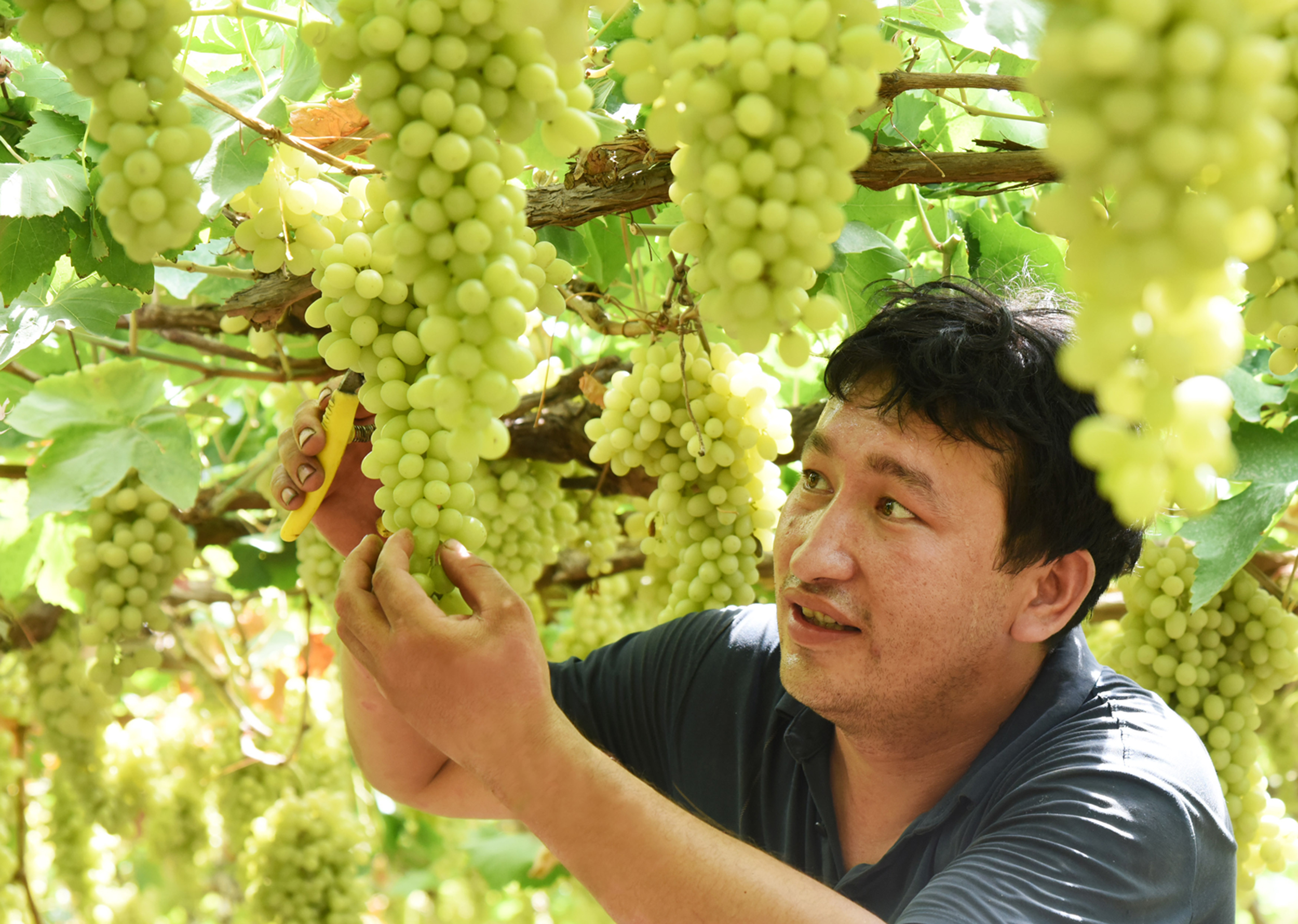7月16日,高昌區(qū)葡萄鎮(zhèn)巴格日社區(qū)葡萄種植基地,果農(nóng)在采摘成熟的葡萄。吐魯番市融媒體中心記者 劉健 攝