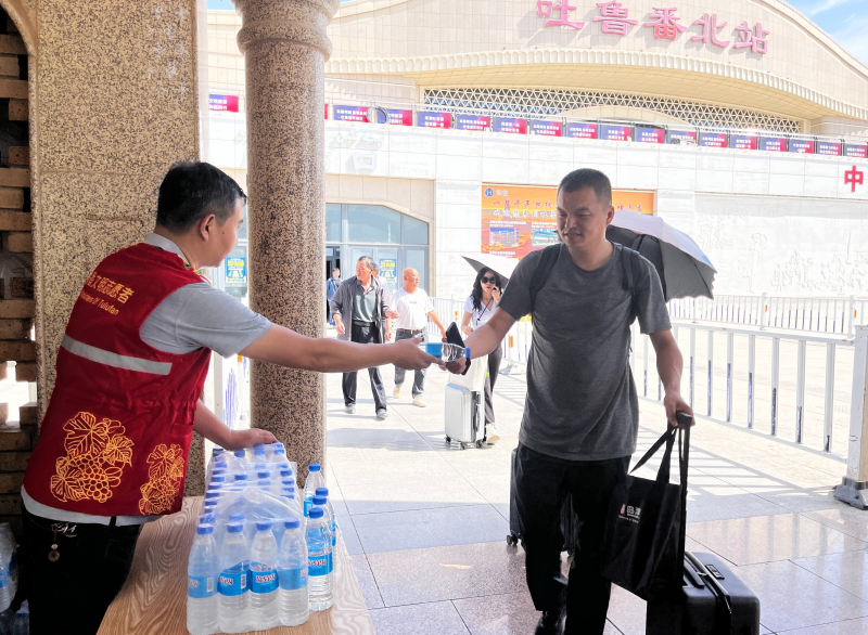 “乘坐公交車、線路車和出租車請往右走,私家車和網約車請往左走……”近日,在吐魯番北站出站口,身穿紅色馬甲的志愿者不斷揮手示意,為到站旅客提供貼心的指引服務。面對酷暑高溫,志愿者們還為旅客送上最受歡迎的“見面禮”——礦泉水,并貼心提醒做好防曬補水,讓長途旅行的游客初到吐魯番便感受到陣陣清涼。