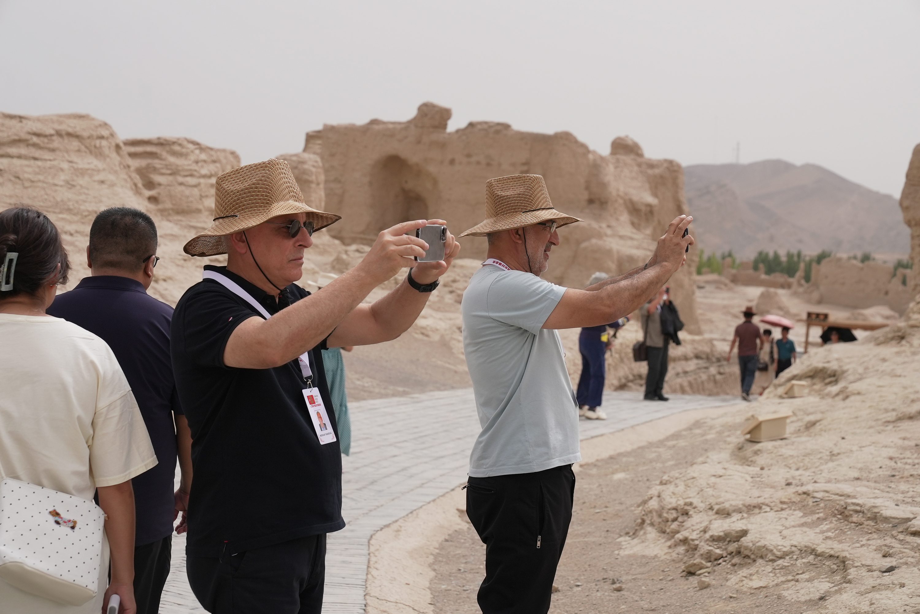 代表團(tuán)成員在交河故城拍攝新聞素材。吐魯番市融媒體中心記者 劉字昂 攝