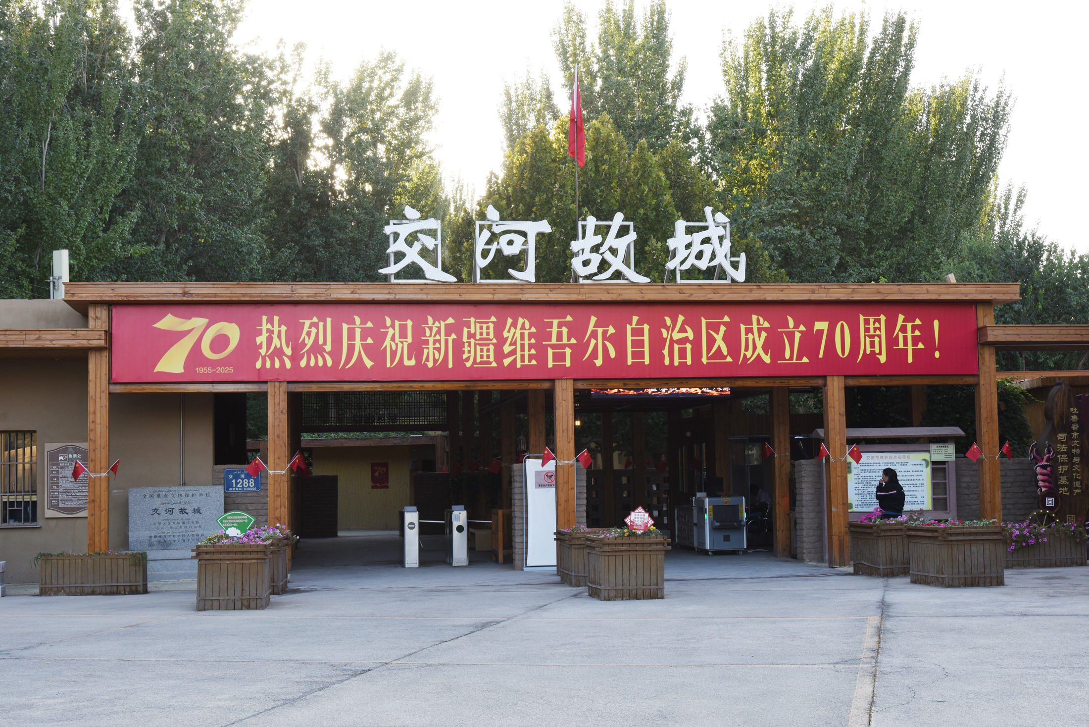9月16日,交河故城景區入口懸掛的印有新疆維吾爾自治區成立70周年的慶祝標語。 吐魯番市融媒體中心記者 劉健 攝