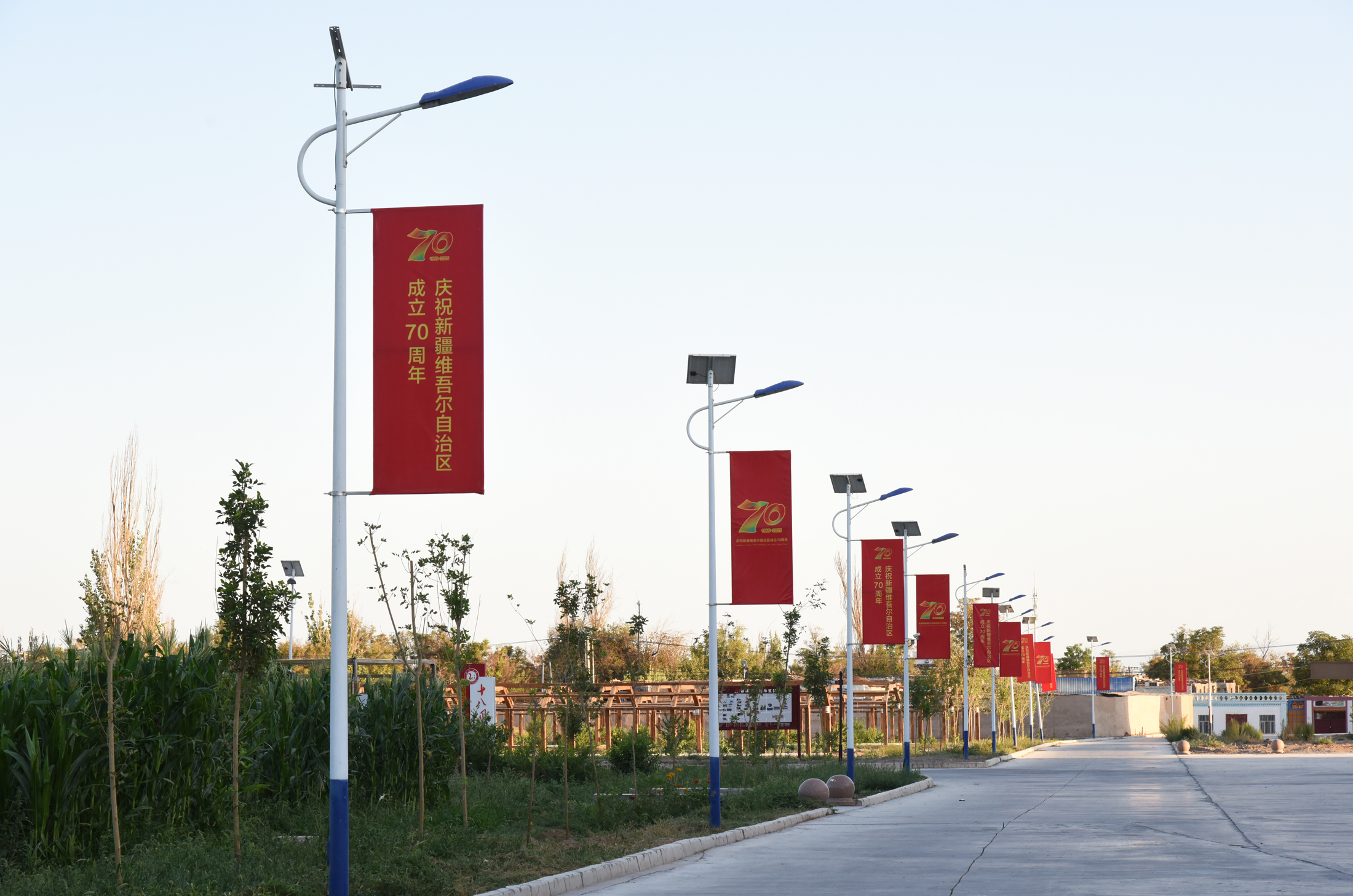 9月16日,高昌區亞爾鎮新城西村道路兩側的燈桿上懸掛印有新疆維吾爾自治區成立70周年慶?;顒訕俗R的道旗。吐魯番市融媒體中心記者 劉健 攝
