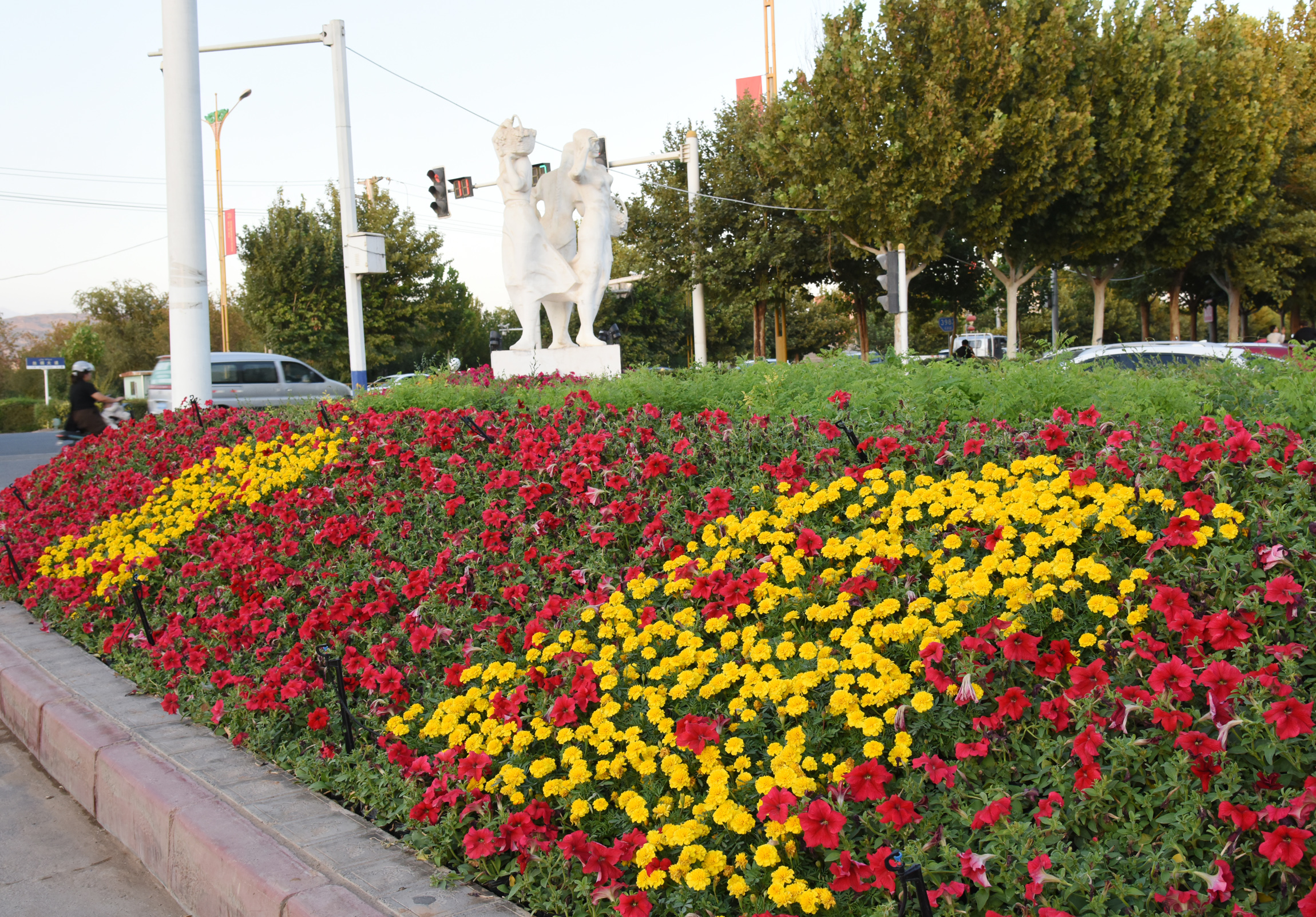 9月16日,高昌區新站路旁擺放的花卉造型。吐魯番市融媒體中心記者 劉健 攝