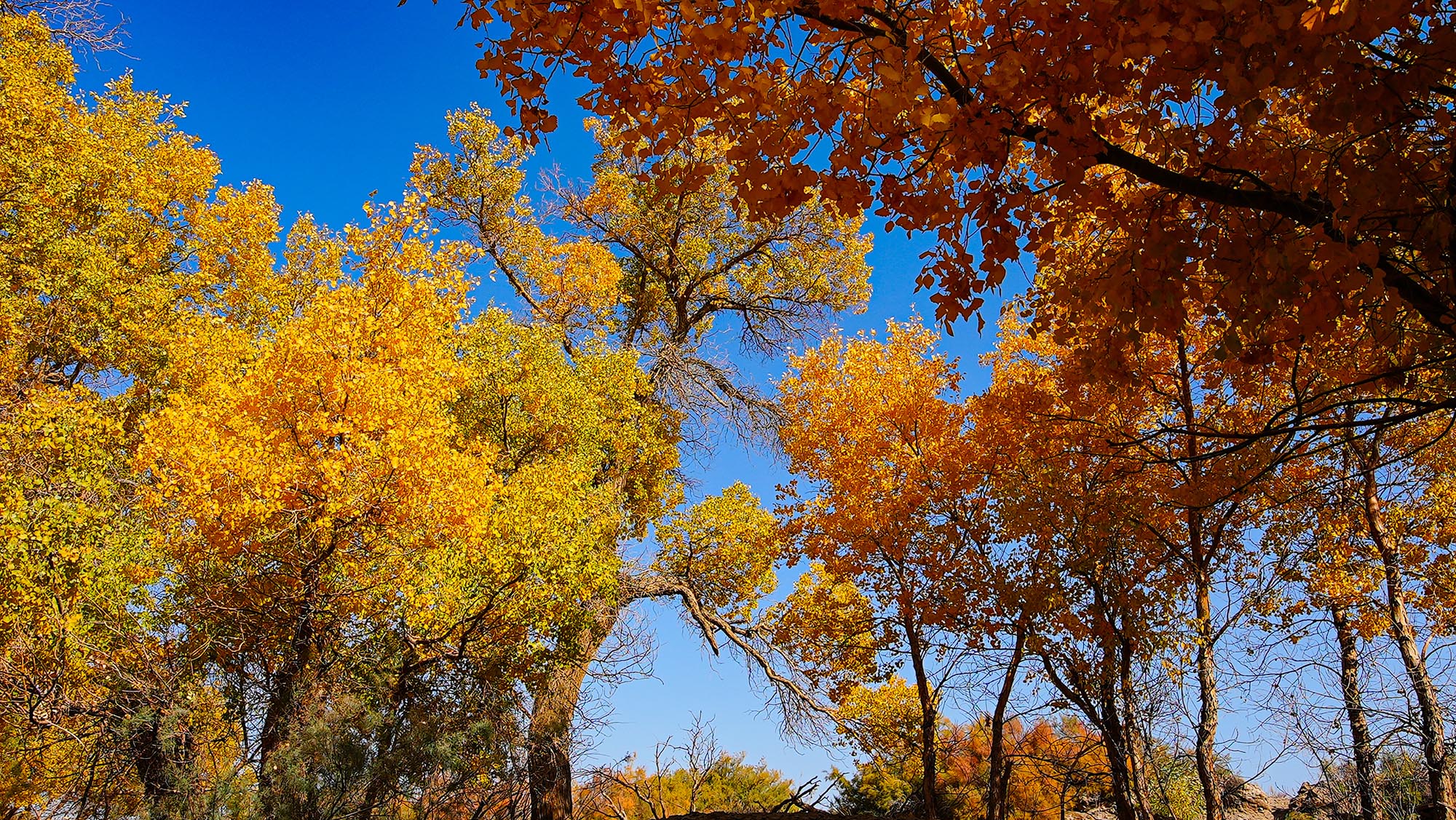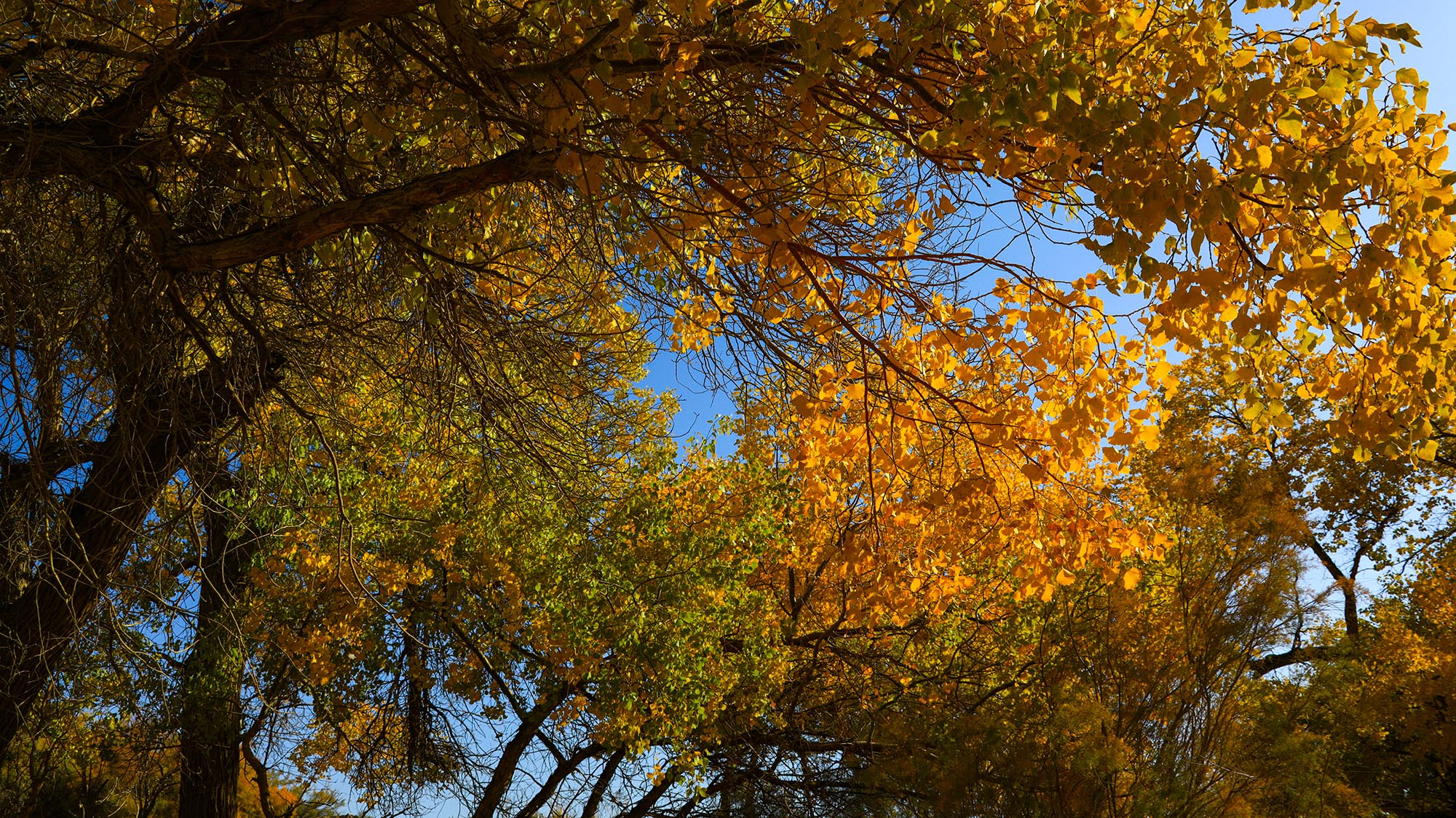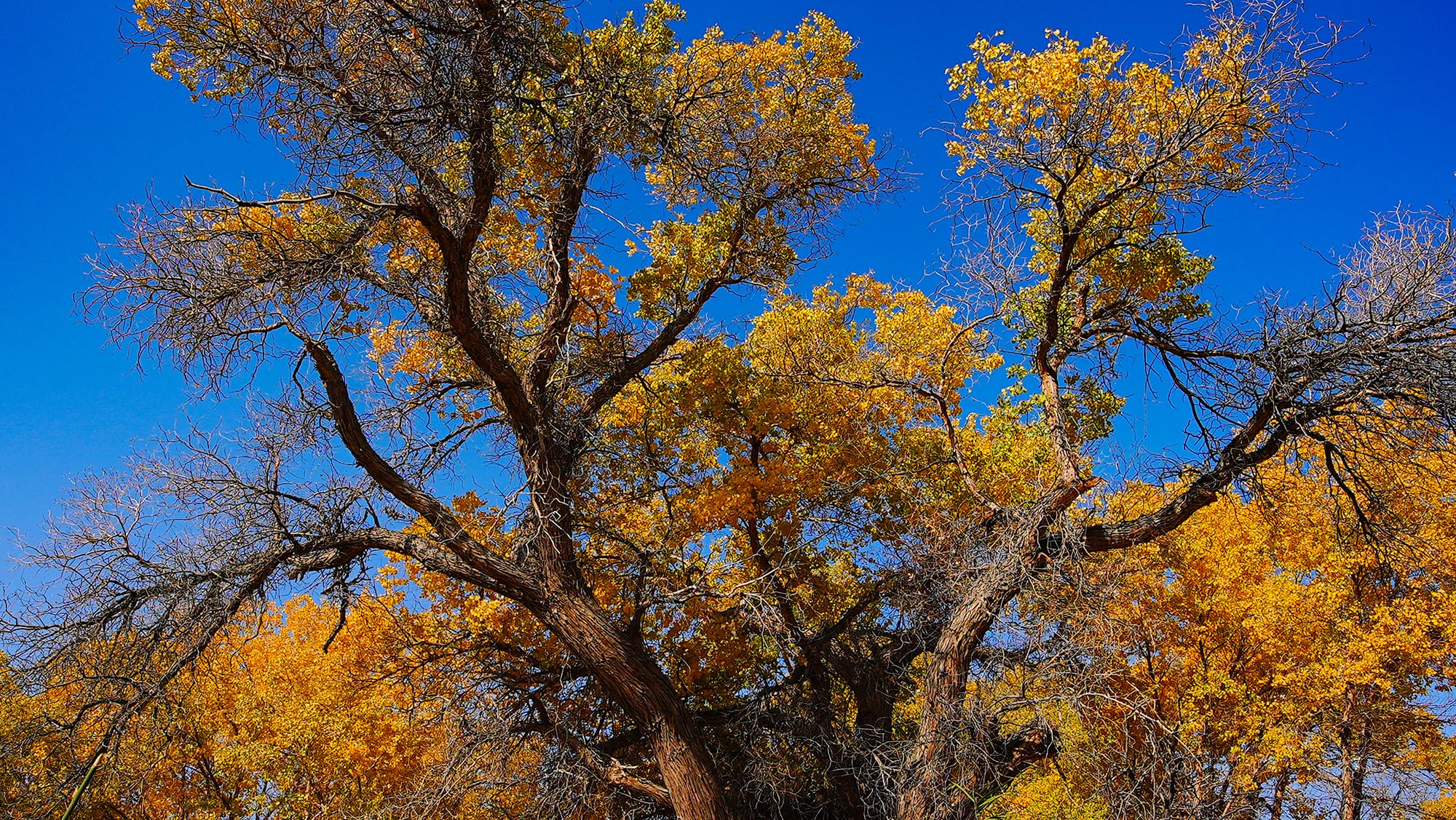 金色的胡楊與湛藍(lán)的天空交相輝映。