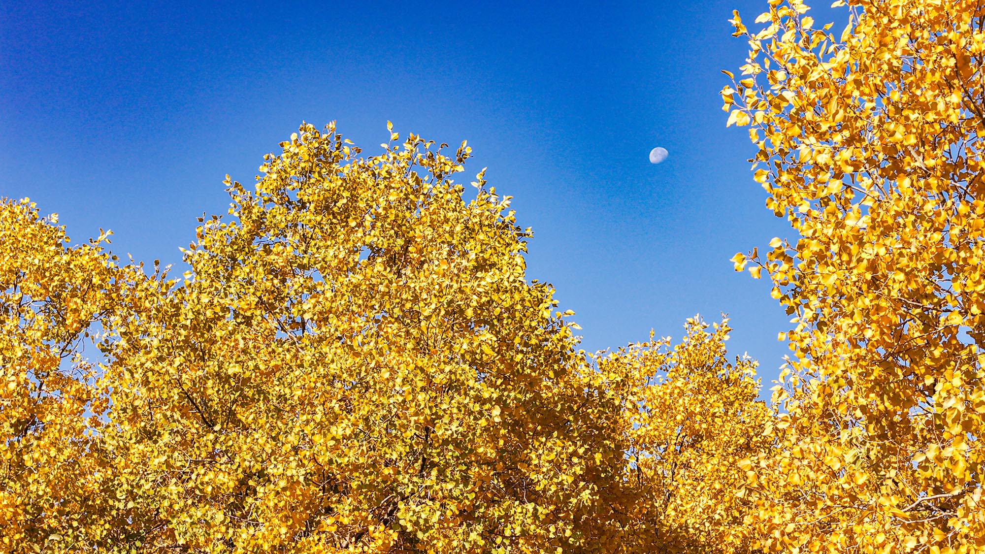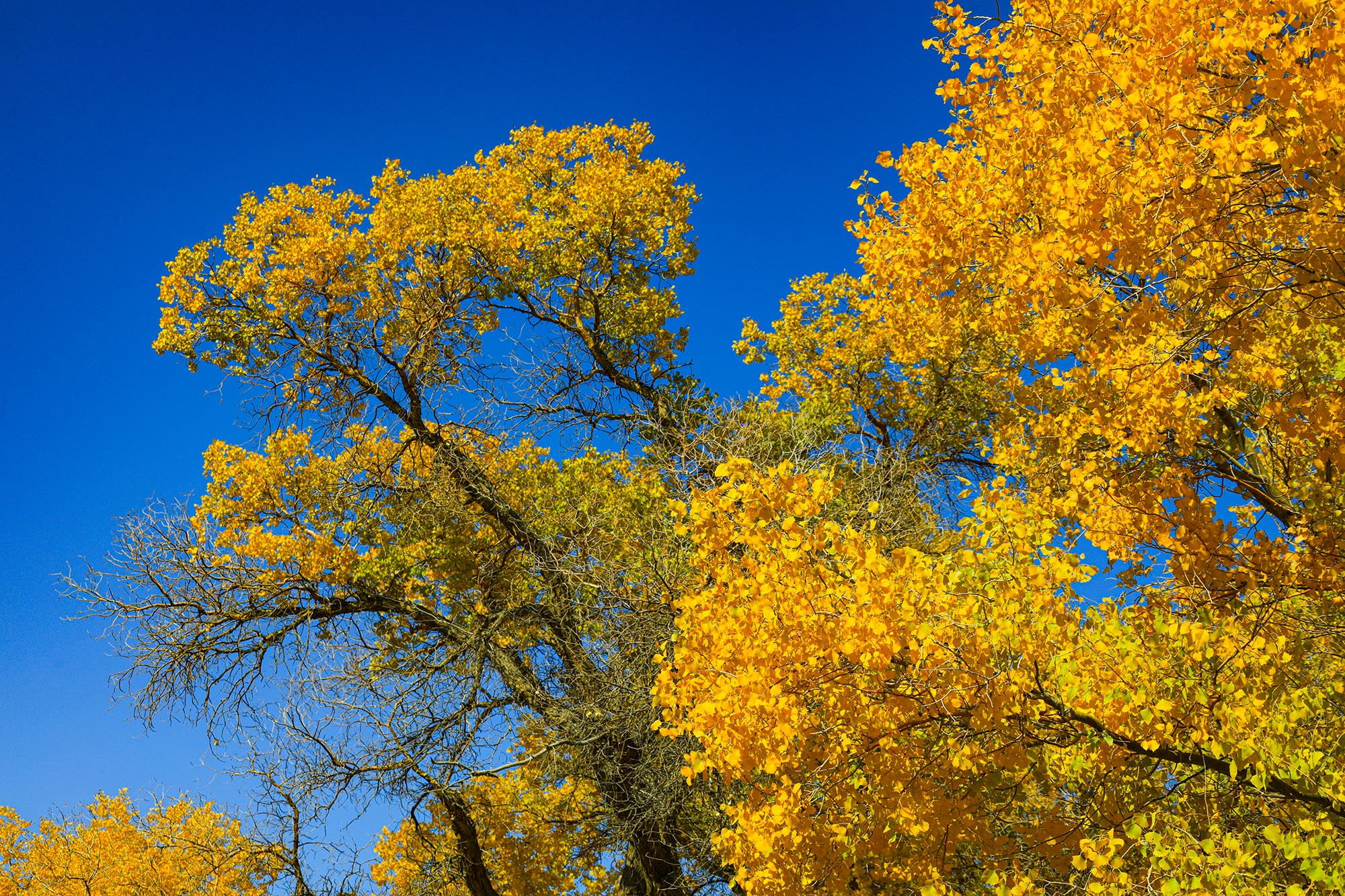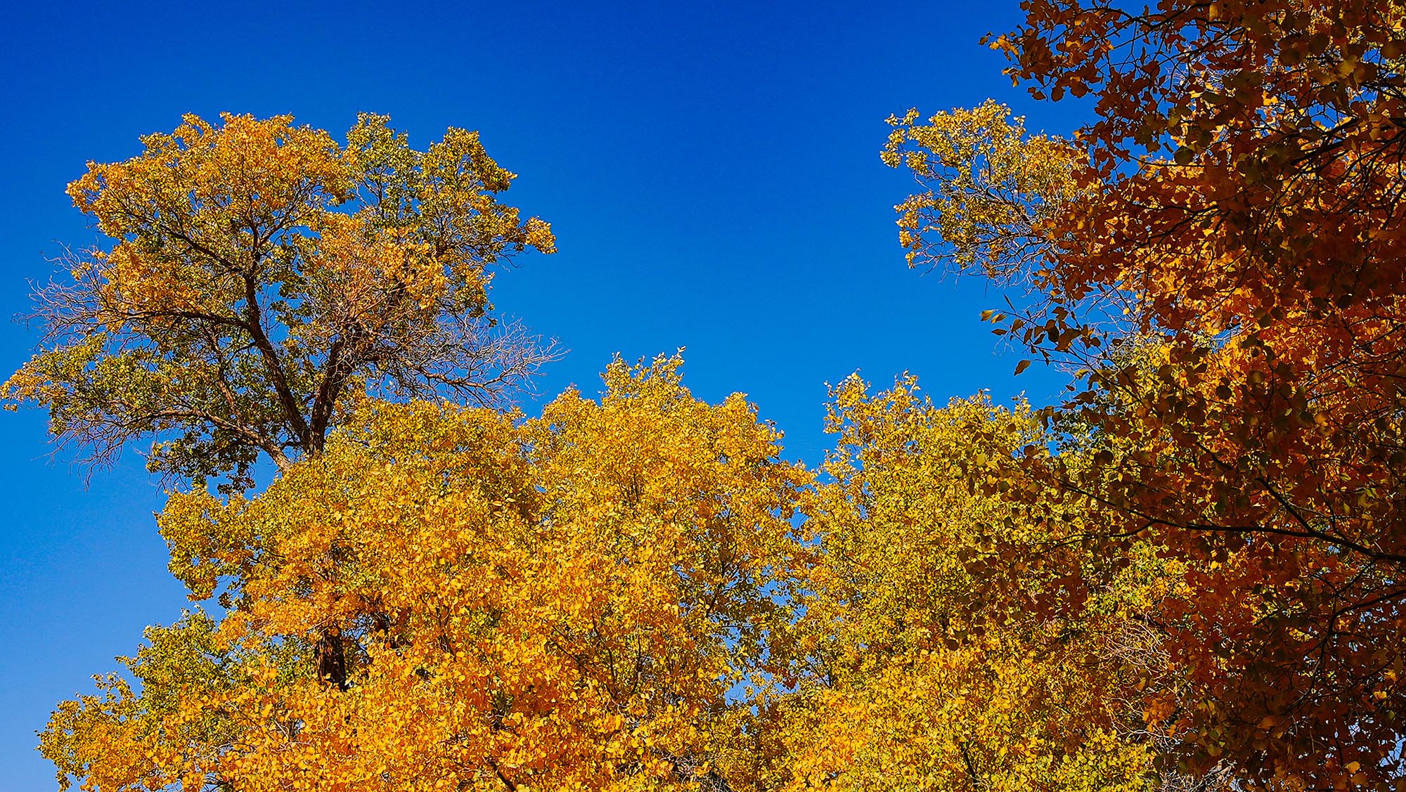 金色的胡楊與湛藍(lán)的天空交相輝映。