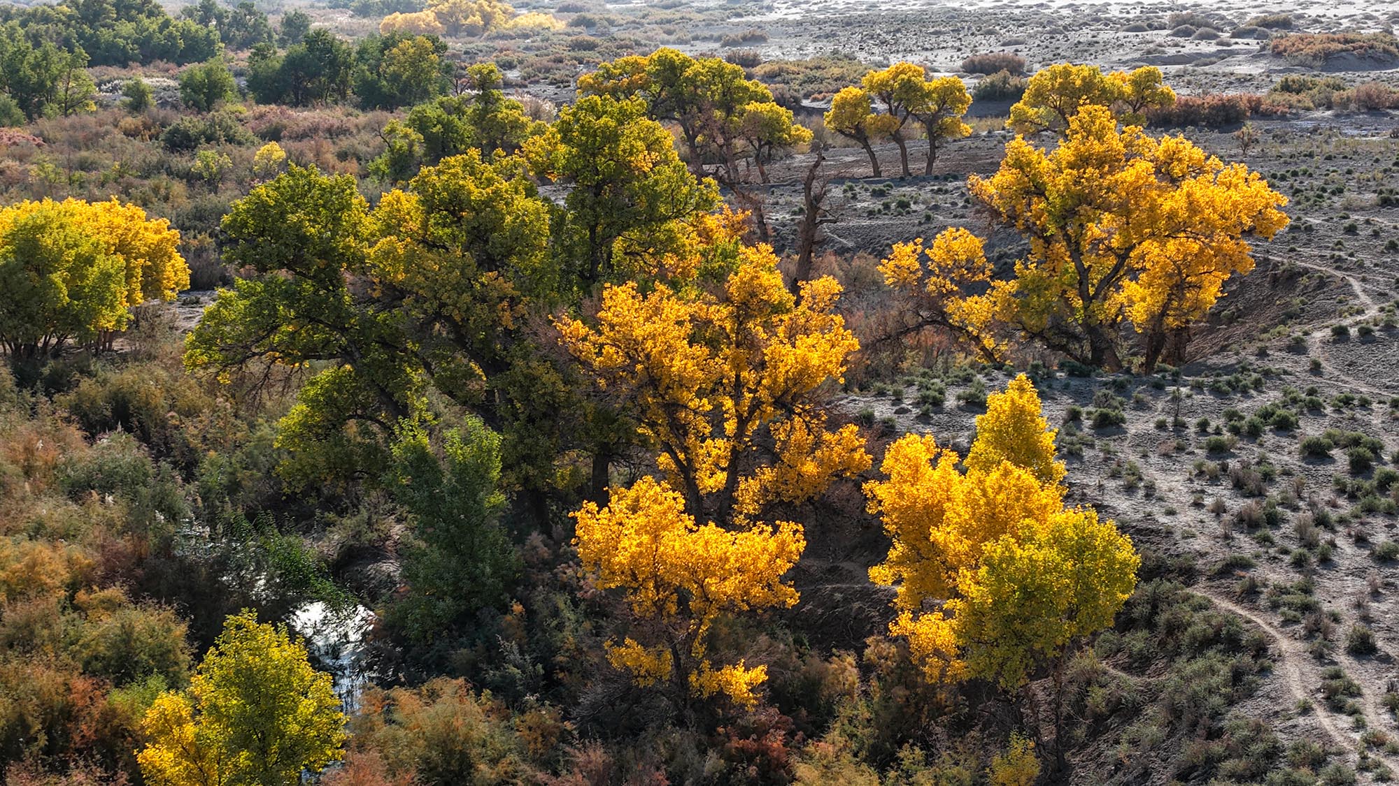 極目遠(yuǎn)眺,金黃與湛藍(lán)交織,胡楊與天空相映,構(gòu)成一幅層次分明、色彩濃烈的秋日長卷。據(jù)了解,這片胡楊林已靜靜佇立百年之久。得益于特殊的地理位置與當(dāng)?shù)爻掷m(xù)的保護努力,它至今仍保持著原始而純粹的自然風(fēng)貌,成為時光深處一處堅韌而璀璨的風(fēng)景。