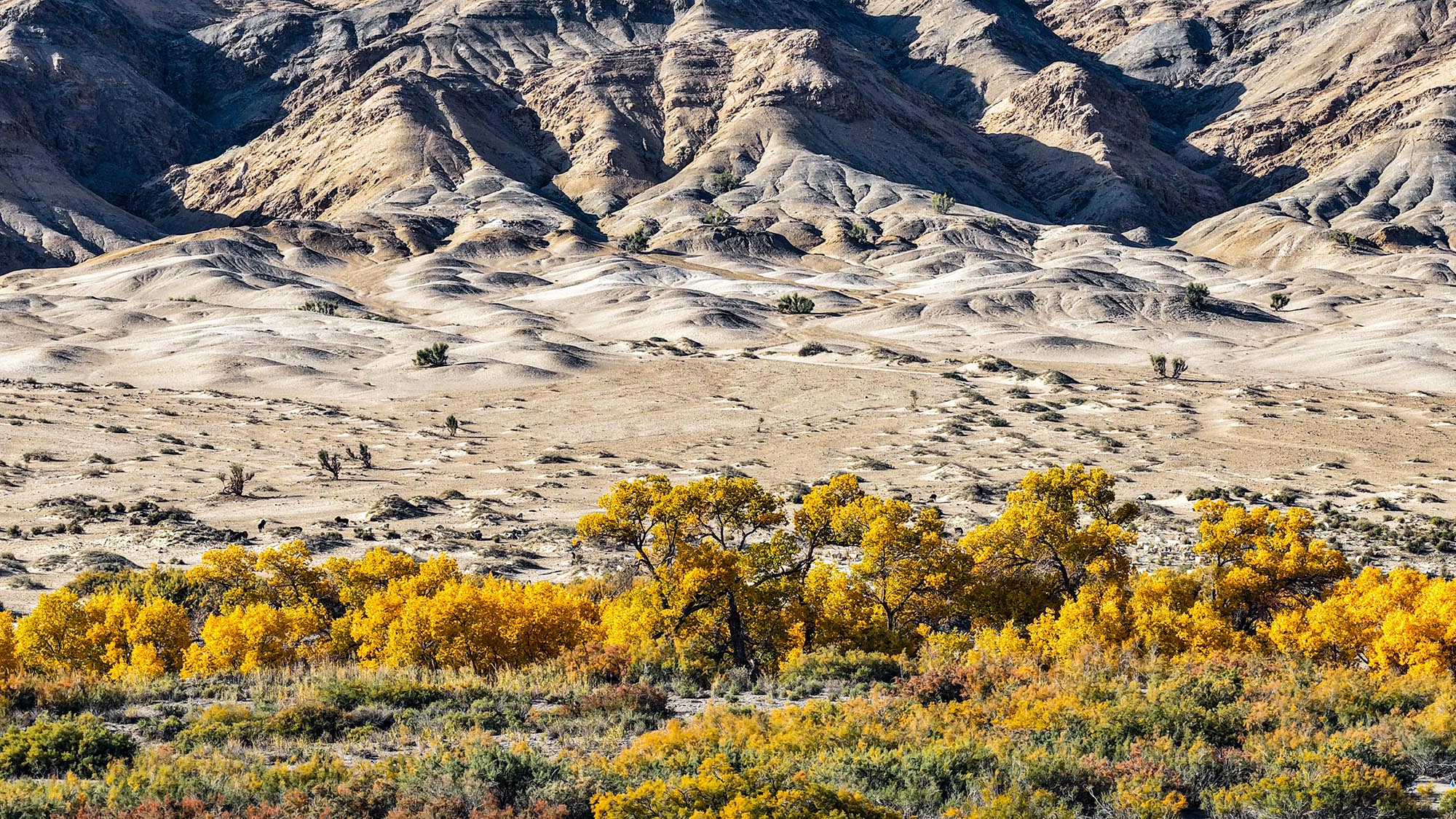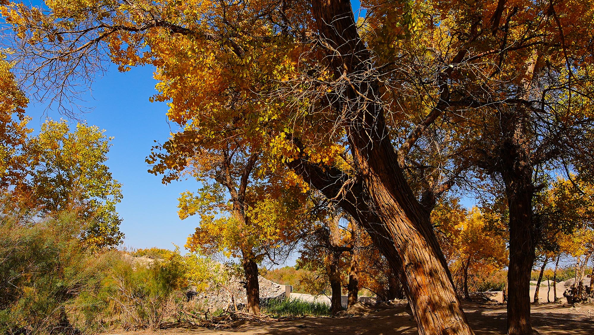 柯爾克孜鐵米村山腳下的胡楊林美景。