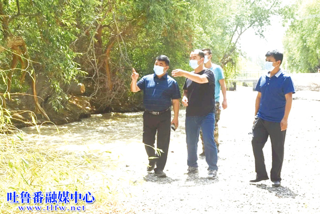 吾買爾·買買提(左一)和相關人員一起巡查河道。