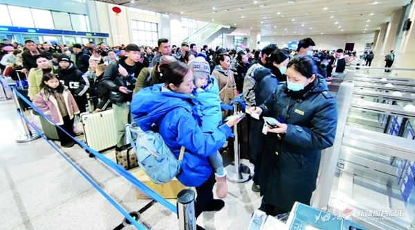 2月16日,伊寧火車站工作人員在檢票口為特殊旅客檢票。當日凌晨,伊寧市迎來雨雪天氣,火車站工作人員用細心周到的服務(wù)讓旅客回家的路更順利和溫暖。 天山網(wǎng)-新疆日報記者鄒懿攝