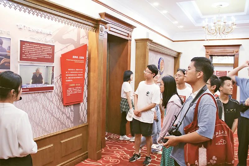 綏芬河國家安全教育展館面積約1100平方米,由序廳、總體國家安全觀、無名豐碑、周恩來展區等8個部分組成,展示了總體國家安全觀、黨的隱蔽戰線光輝歷史、當前斗爭形勢等內容。李大釗、周恩來等老一輩革命家在綏芬河出入境蘇聯時曾秘密下榻于此。作為早期紅色秘密國際通道、秘密交通線掩護站點,展館建筑如今成為珍貴的紅色革命歷史遺址。圖為2023年8月15日,大學生在展館內參觀學習。 國安宣工作室供圖