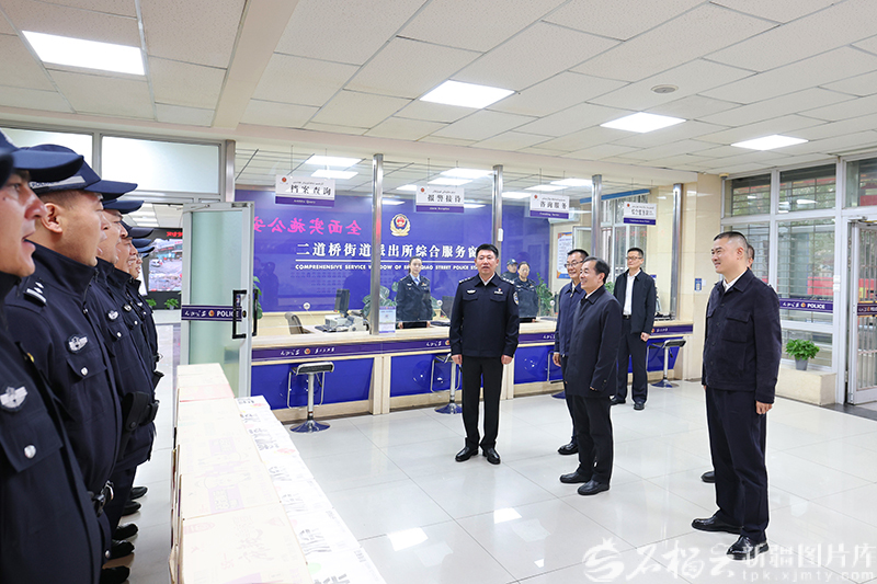 10月5日,自治區黨委書記、兵團黨委第一書記、第一政委陳小江在烏魯木齊市公安局二道橋街道派出所,看望慰問基層政法干警,向節日期間堅守崗位的一線干部職工致以親切問候。石榴云/新疆日報記者 崔志堅攝