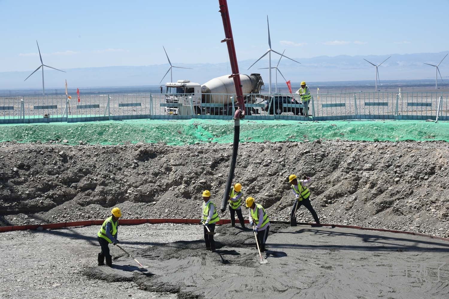 工人配合施工車(chē)輛進(jìn)行地基澆筑作業(yè)。 葡萄熟了/吐魯番市融媒體中心記者 劉健 攝