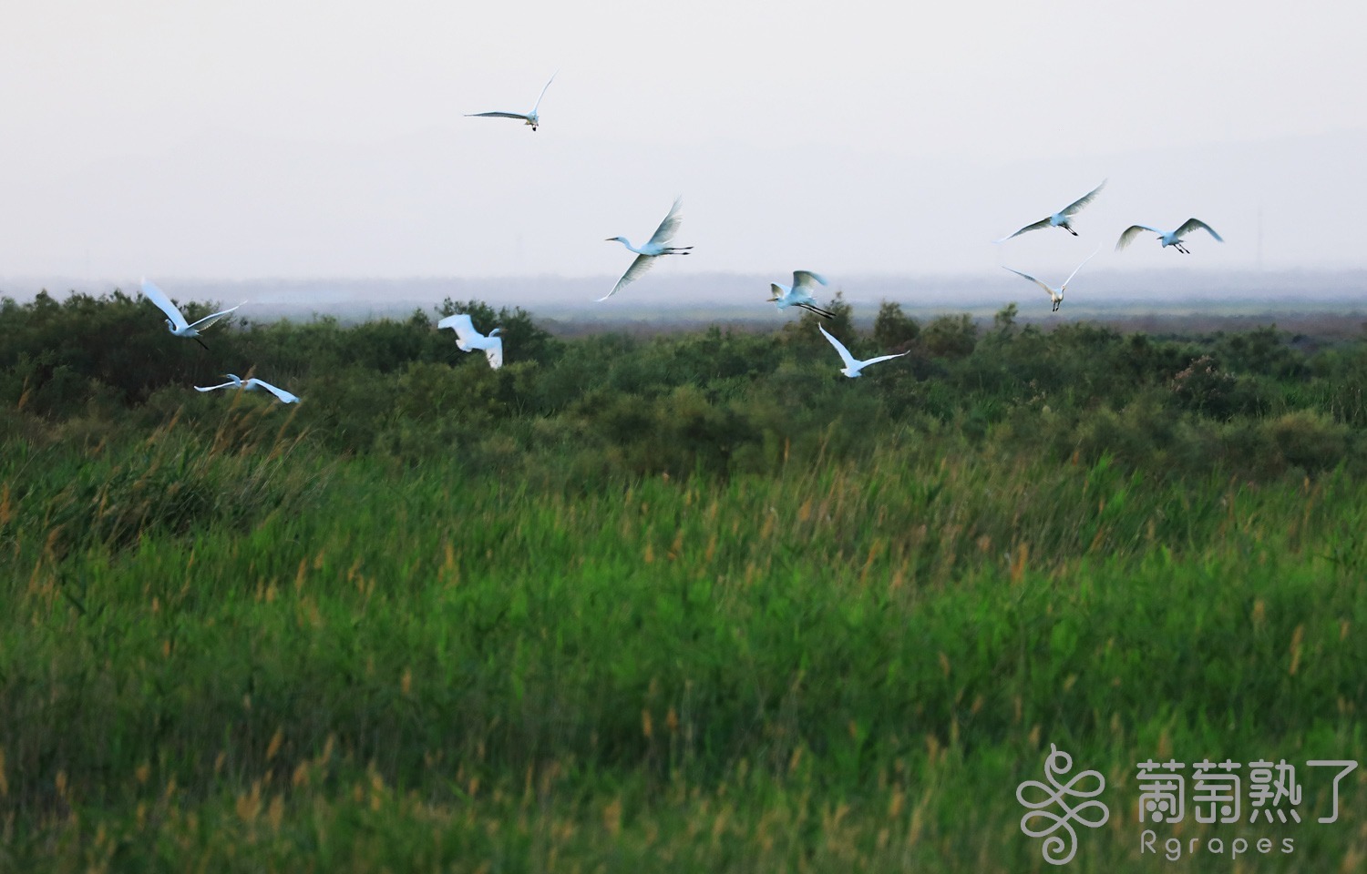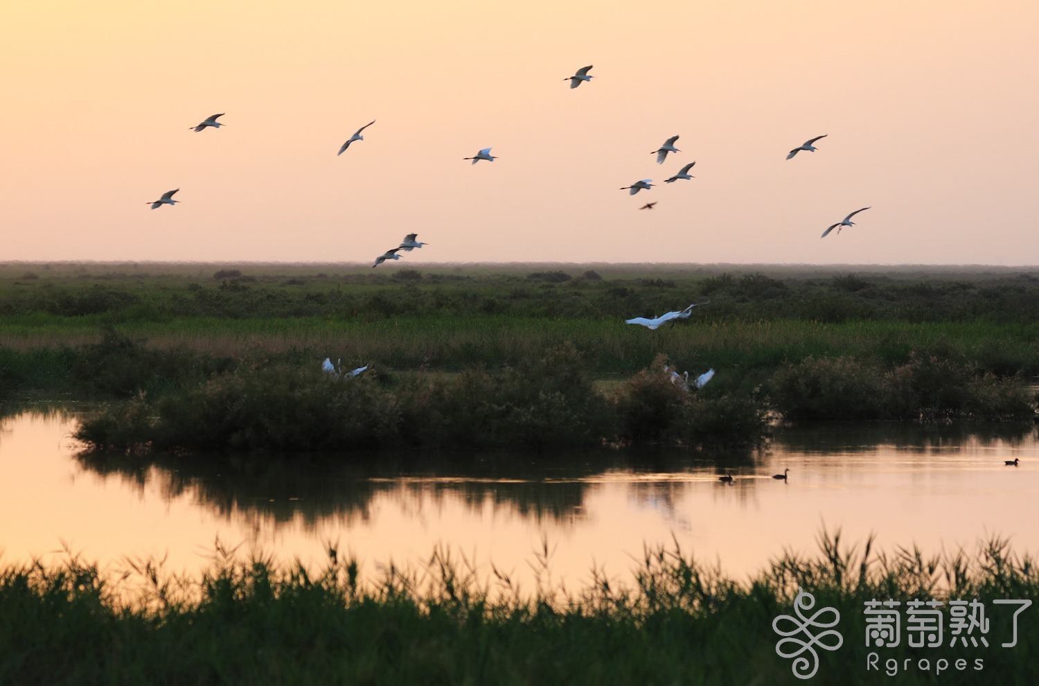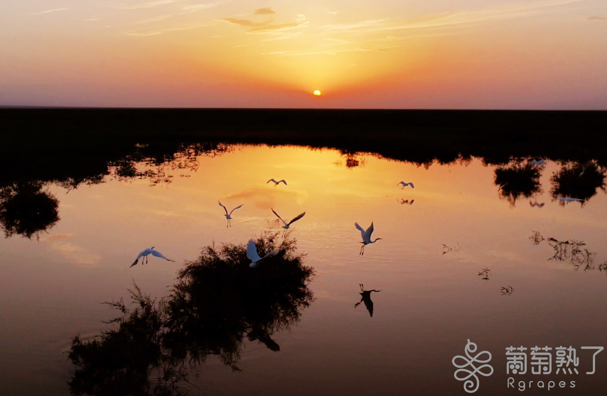 8月26日,白鷺在夕陽下的艾丁湖濕地飛翔。葡萄熟了/吐魯番市融媒體中心記者 朱福平 攝