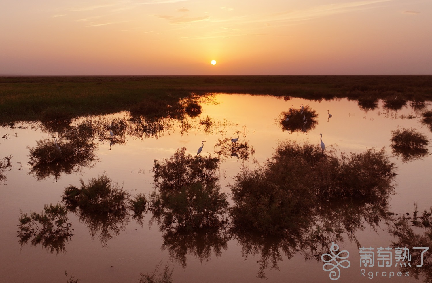 8月26日,白鷺在夕陽下的艾丁湖濕地棲息。葡萄熟了/吐魯番市融媒體中心記者 朱福平 攝
