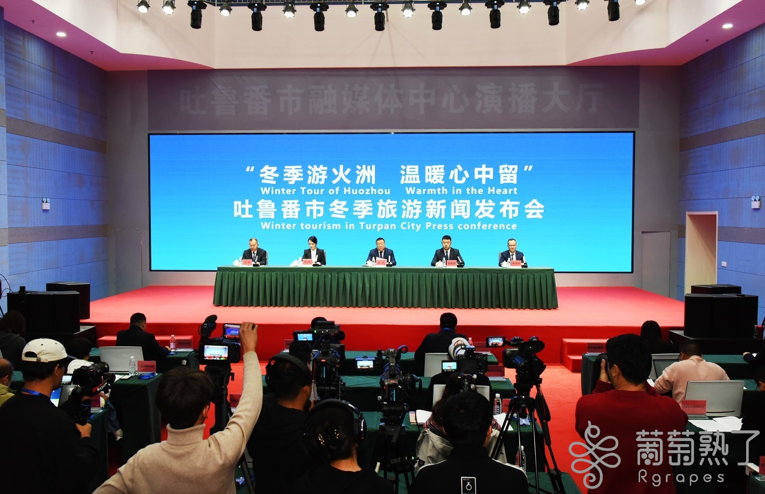 11月8日,“冬季游火洲 溫暖心中留”吐魯番市冬季旅游新聞發布會召開。通過現場推介和答記者問等方式,向廣大游客介紹吐魯番冬季旅游的特色亮點及優惠政策,進一步激活吐魯番冬季旅游市場活力,提升“絲路明珠 葡萄圣城”旅游目的地知名度和吸引力。圖為發布會現場。葡萄熟了/吐魯番市融媒體中心記者 劉健 攝
